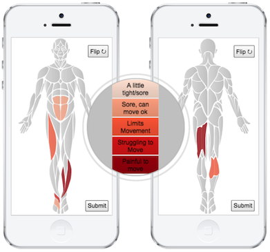 Mobile touch screen interface: Players submit multiple areas of muscle soreness quickly and easily from their phone, tablet or computer.